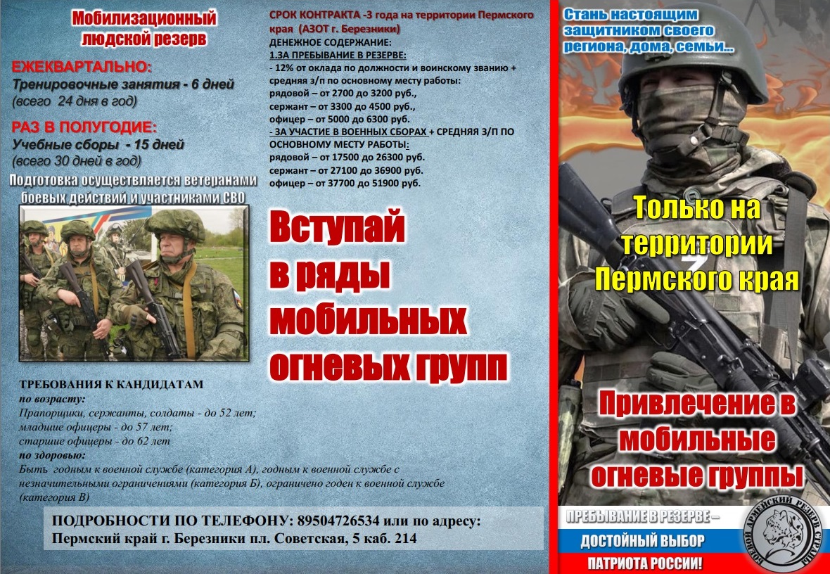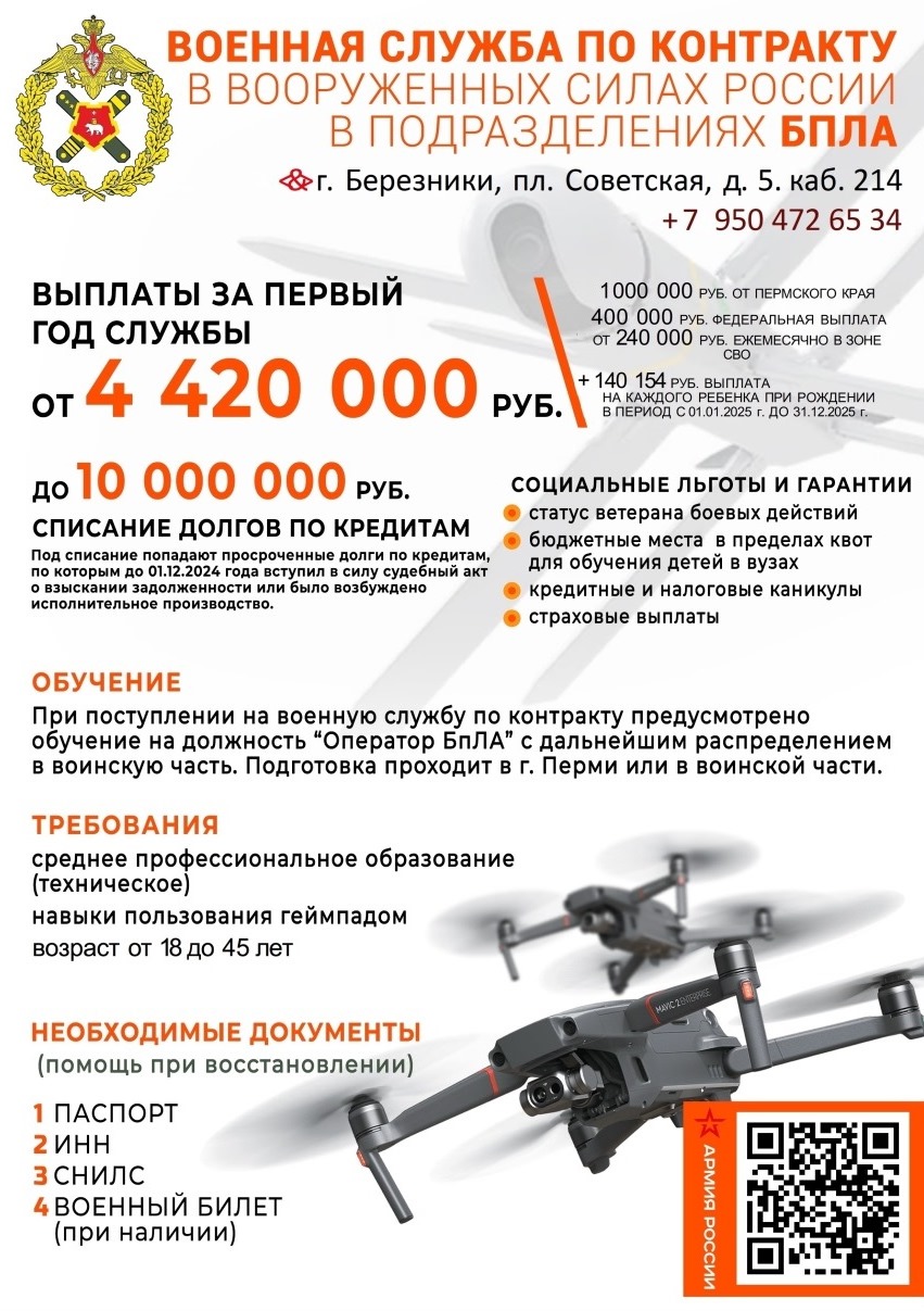 Граждан приглашают на военную службу по контракту в вооруженных силах России в подразделениях БПЛА и в ряды мобильных огневых групп. Подробная информация - на листовках.