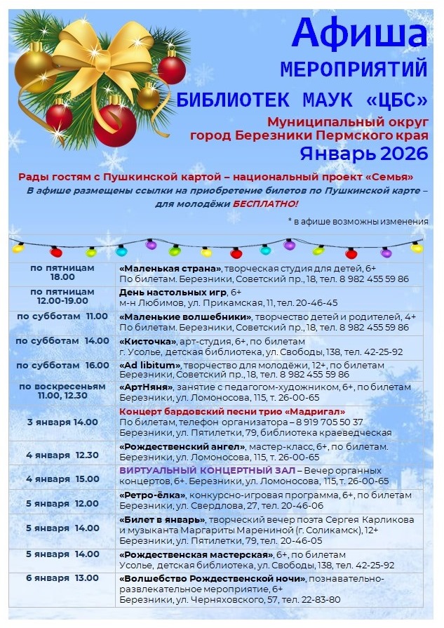 В январе нового 2026 года приглашаем в городские и сельские библиотеки на познавательные медиапрограммы, игры и квесты, на занятия в творческих мастерских и клубах, на музыкальные программы Виртуального концертного зала и живые концерты.
