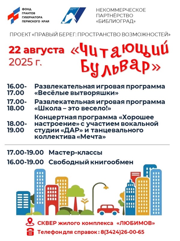 Приглашаем 22 августа с 16.00 до 19.00 в сквер м/р "Любимов" на арт-площадку под открытым небом "Читающий бульвар". В программе – яркие концерты, весёлые игры, зажигательные развлечения, свободный книгообмен, творческие занятия.