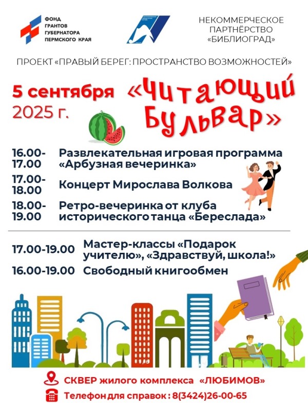 5 сентября с 16.00 до 19.00 вновь встречаемся на "Читающем бульваре" в сквере микрорайона "Любимов". В программе – живой концерт, весёлые игры, зажигательные танцы, свободный книгообмен, творческие занятия.