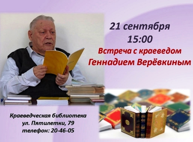 21 сентября в 15:00 краеведческая библиотека № 6 приглашает на встречу с краеведом Геннадием Ивановичем Верёвкиным.