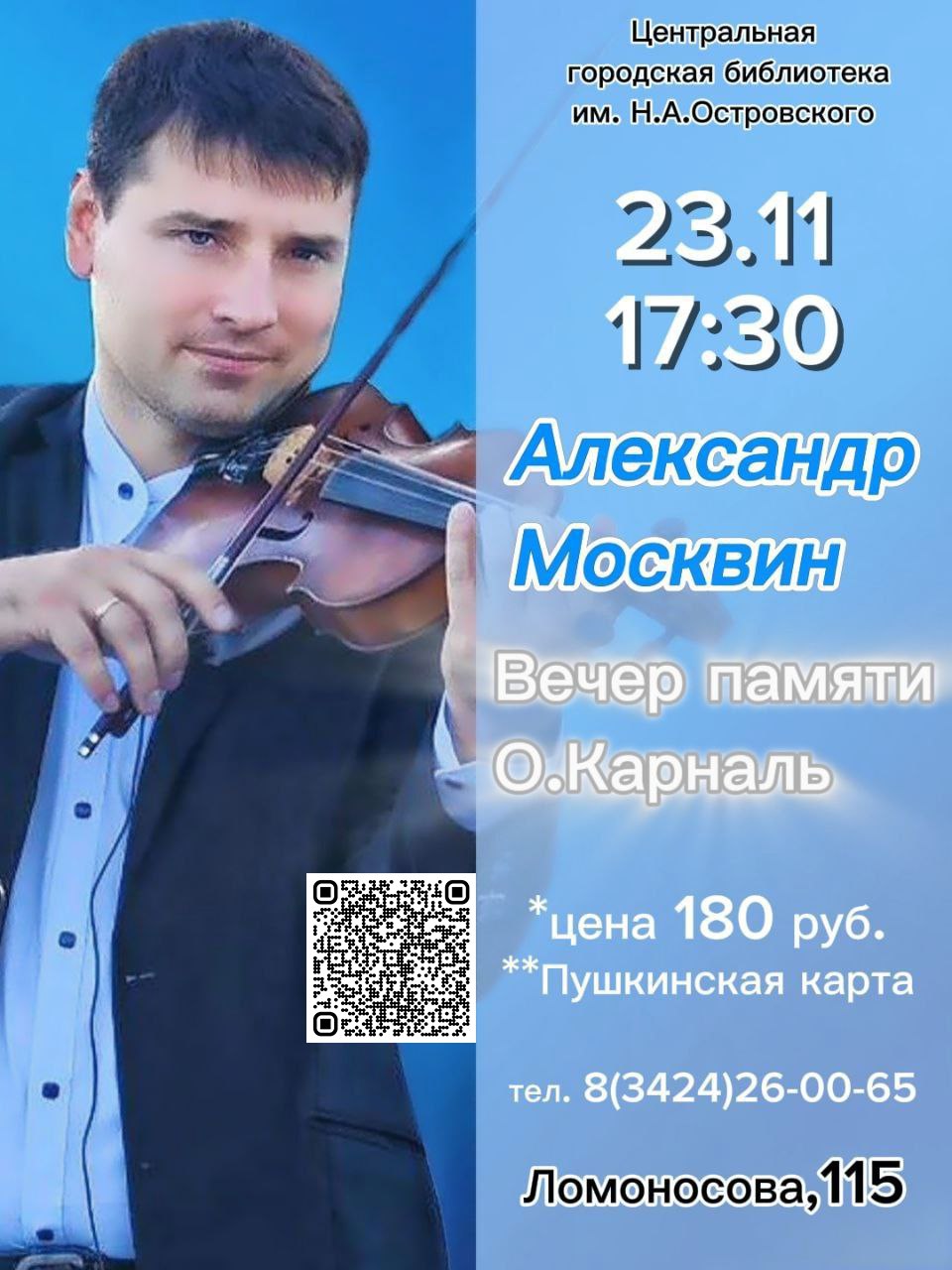 Приглашаем на вечер памяти Ольги Карналь 23 ноября в 17:30 в Центральную городскую библиотеку им. Н. А. Островского. Прозвучат произведения в исполнении березниковского скрипача Александра Москвина.