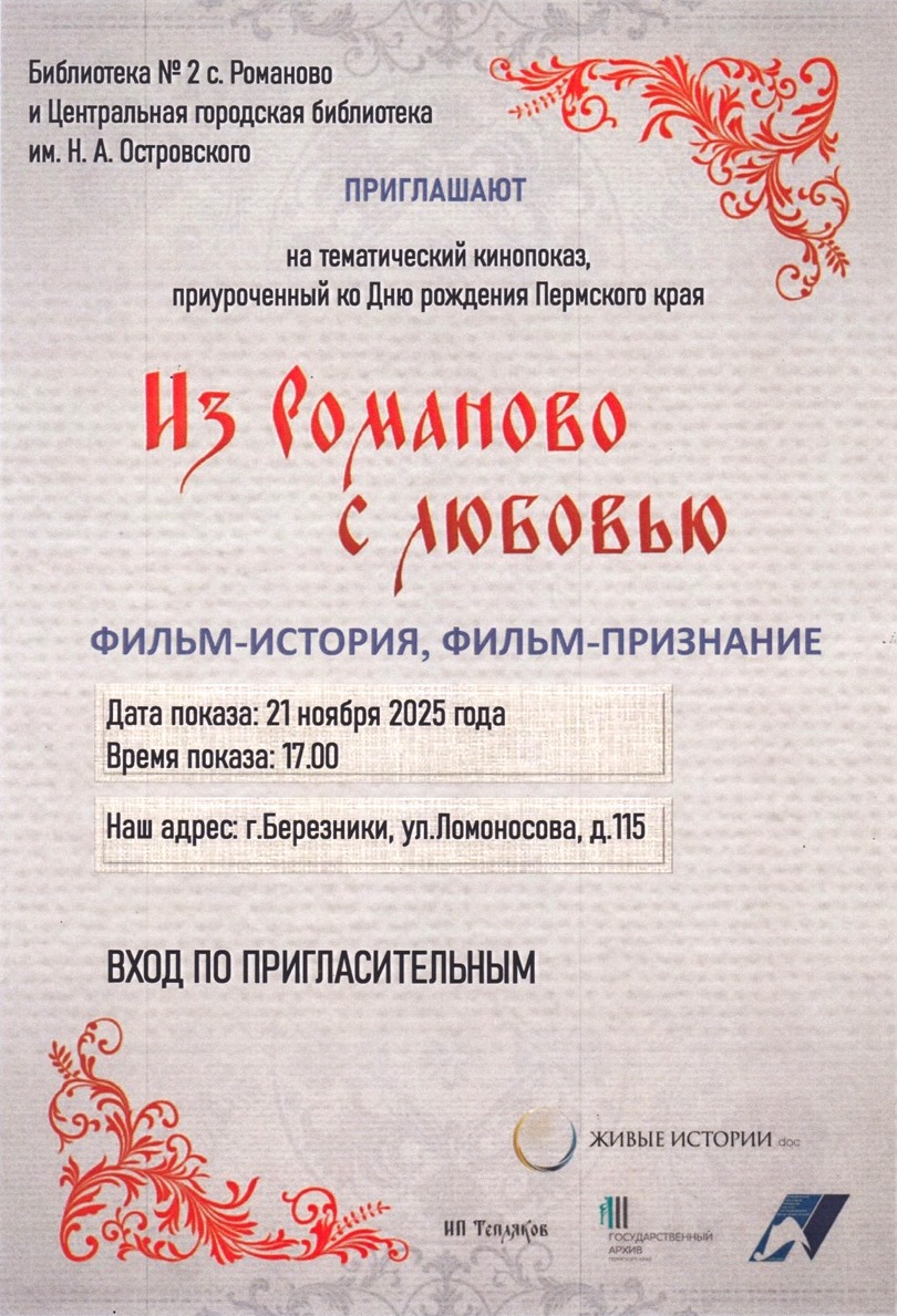 21 ноября в 17:00 по многочисленным просьбам в Центральной городской библиотеке им. Н. А. Островского состоится показ документального фильма "Из Романово с любовью".