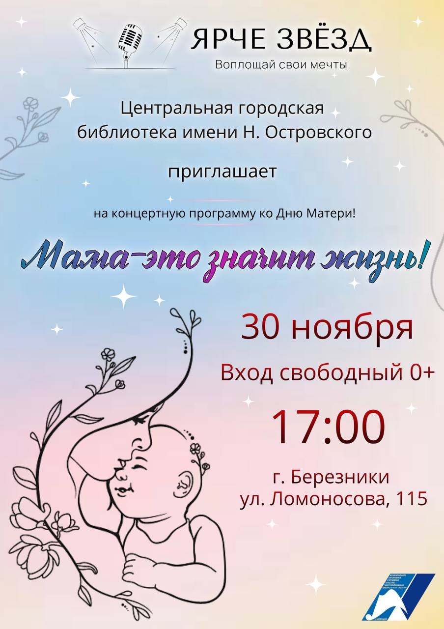 Центральная городская библиотека им. Н. А. Островского приглашает 30 ноября в 17:00 на концертную программу вокальной студии "Ярче звёзд" в честь Дня матери.