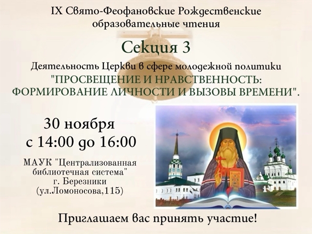 30 ноября с 14:00 до 16:00 в Центральной городской библиотеке им. Н. А. Островского будет работать Секция № 3 в рамках IX Свято-Феофановских образовательных чтений Соликамской епархии.