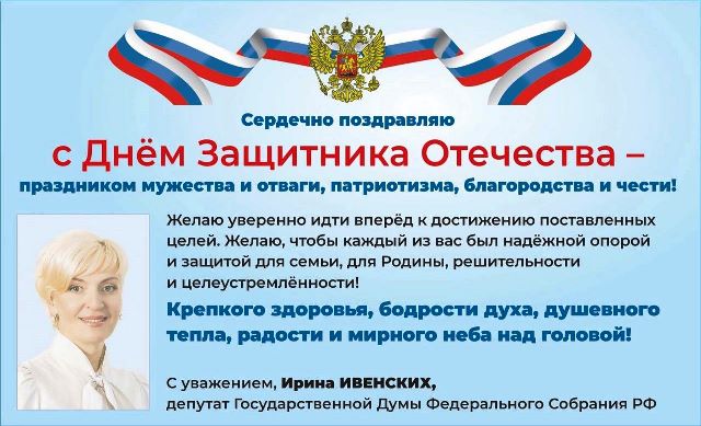 Депутат Государственной Думы Федерального Собрания Российской Федерации И. В. Ивенских поздравляет жителей муниципальных округов с Днём защитника Отечества.