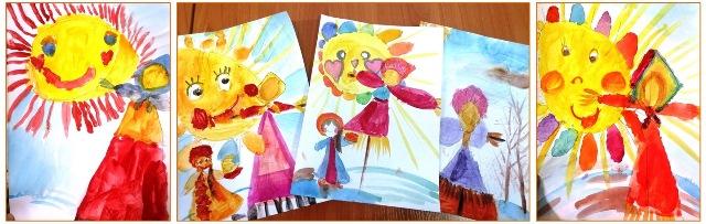 Используя акварельную технику рисования, ребята изобразили чучело Масленицы и яркое весеннее солнце, приветливо зазывающее весну и растапливающее первые проталинки. Все мы с нетерпением ждём весенних деньков.