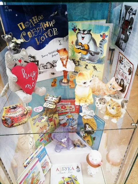 На выставке котам отведена отдельная полка, дополненная экспонатами из коллекции библиотекаря ЦГБ Анастасии Юшковой. Ярко характерные коты-фигурки из различных материалов перекликаются с образами котов Виктора Чижикова.