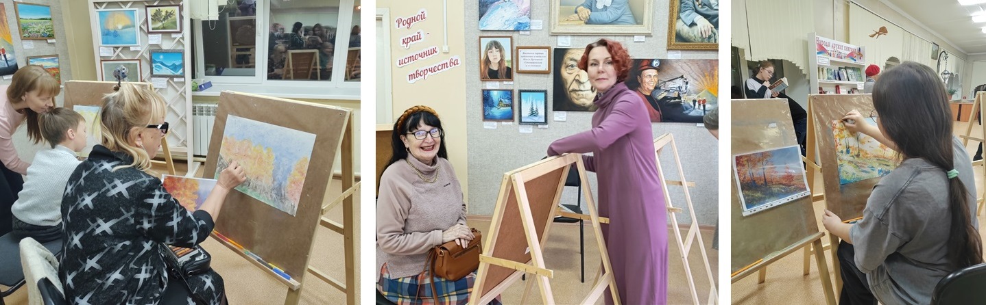 Воспринимать родной край, как источник творчества может только любящий человек. О своей любви на языке изобразительного искусства поведала Ольга Пронина-Станишевская (на фото в центре). Её мастерская "Родной край – источник творчества" пригласила детей и взрослых попробовать свои силы в создании живописного шедевра.