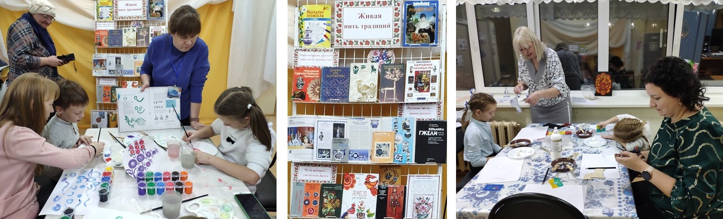 Искусство, как культурный код народа, живёт во всём, что окружает человека. И повседневный быт – не исключение. Чтобы сделать его теплее и уютнее, человек всегда стремился украсить предметы быта и кухонную утварь. С традициями русской народной росписи гости познакомились на мастер-классах под общим названием "Творения души и рук". Об истории урало-сибирской росписи рассказала Светлана Вязьмина (библиотекарь ЦГБ). Ирина Журавлёва (библиотека № 10) раскрыла секреты Гжели и Хохломы.