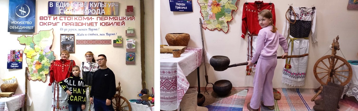Примерить на себя настоящие костюмы коми-пермяков, подержать ухват с чугунком, попозировать на фоне старинной утвари и отдохнуть "на завалинке" можно было в фотозоне "Парма – мой родимый уголок", обустроенный содружеством библиотек № 11 и Центральной детско-юношеской им. А. П. Гайдара.