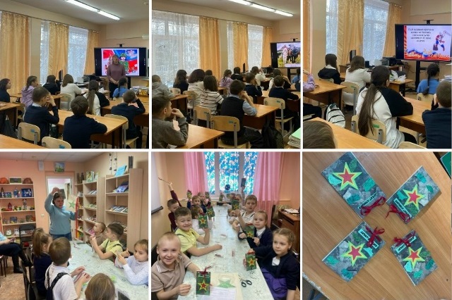 Для первоклассников из школы № 11 и пятиклассников из школы № 12 сотрудниками Детской библиотеки № 9 (экологической) была проведена медиапрограмма "Есть такая профессия – Родину защищать". Ребята проявили неподдельный интерес, слушая рассказ о русских богатырях, известных полководцах и героях войн, совершавших подвиги ради Отечества на протяжении многих веков. Для участников СВО ребята изготовили "Блокнот командира", ведь как гласит народная мудрость: "Плох тот солдат, который не мечтает стать генералом". На первых страницах блокнотов ребята написали пожелания с праздником и нарисовали рисунки.