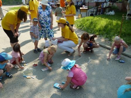 Дети приняли активное участие в забавном конкурсе "Книжная грация", в весёлой подвижной игре "Путешествие шарика", в конкурсе рисунков на асфальте "Я и мой город". Несколько малышей выразили желание почитать стихи. Ведущие охотно предоставили им сцену.