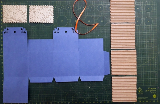 Вырезать из гофрокартона по шаблону 4 шт стеночек, снять с каждой детали с одной стороны верхний слой бумаги, обнажив гофрированный слой
