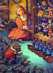 Однажды вечером Мари слишком долго играет в куклы. Когда часы бьют полночь, в гостиной начинается приглушенное шуршание, отовсюду появляются мыши. Из-под пола выбирается огромный семиглавый Мышиный король. Мари в испуге прижимается к стене. На нее начинает наступать мышиное войско. Мари разбивает дверцу шкафа, чем пугает грызунов. Но разбитый шкаф тут же начинает светиться. Игрушки оживают. Щелкунчик собирает войско и ведет его в бой с мышами. Начинается сражение. Постепенно мыши начинают одерживать победу. Щелкунчик оказывается в лапах противника. Мышиный король бросается на него, но Мари, желая спасти любимую игрушку, кидает туфлей прямо в предводителя грызунов. После этого девочка теряет сознание.