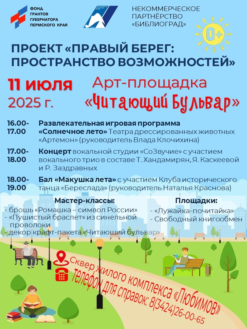 11 июля в 16.00 в сквере м/р "Любимов" состоится открытие летней арт-площадки под открытым небом "Читающий бульвар". В программе для гостей и жителей микрорайона -- яркие концертные номера, интерактивные площадки, книжный развал, где можно взять книги домой, увлекательные творческие занятия"!