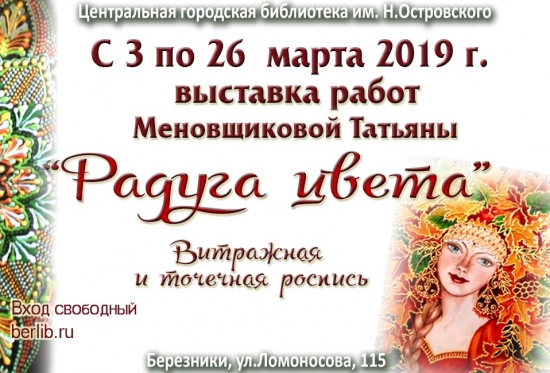 С 3 по 26 марта приглашаем в Центральную городскую библиотеку им.Н.Островского на выставку "Радуга цвета" . Работы в технике витражной и точечной росписи мастерицы Меновщиковой Татьяны.