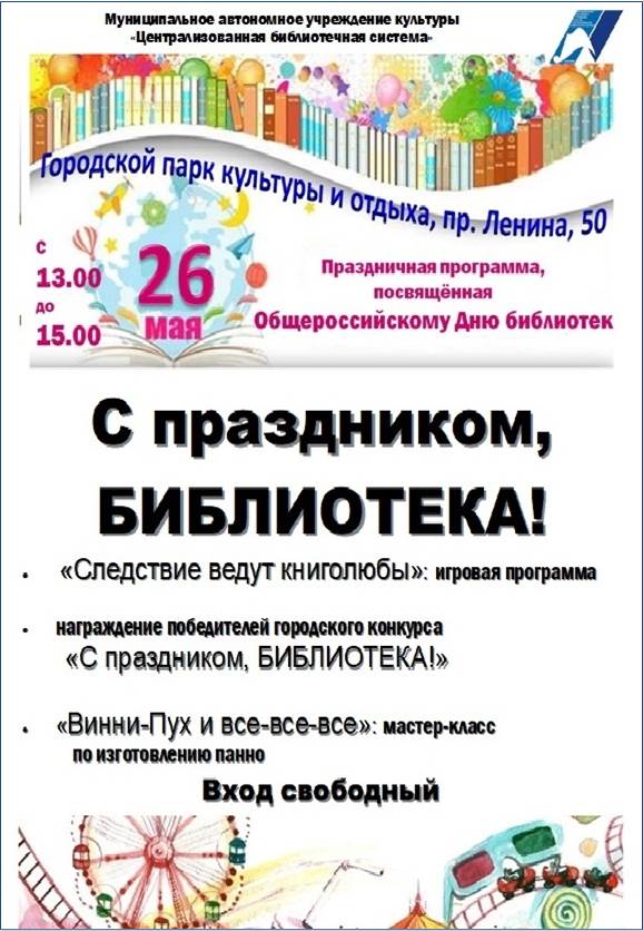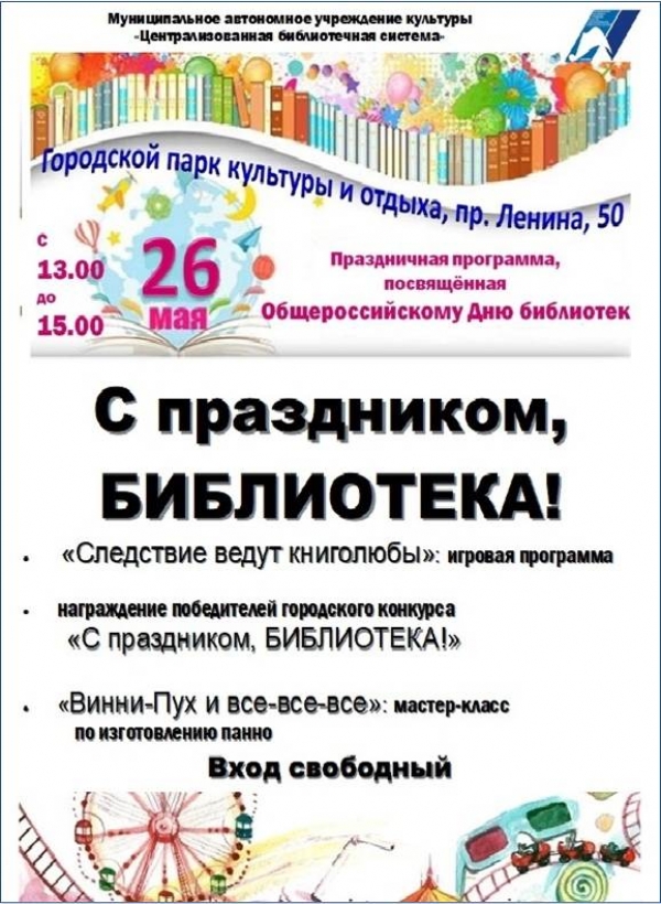 26 мая в 13.00 приглашаем жителей города в парк культуры и отдыха на праздничную программу, посвященную Общероссийскому Дню библиотек.